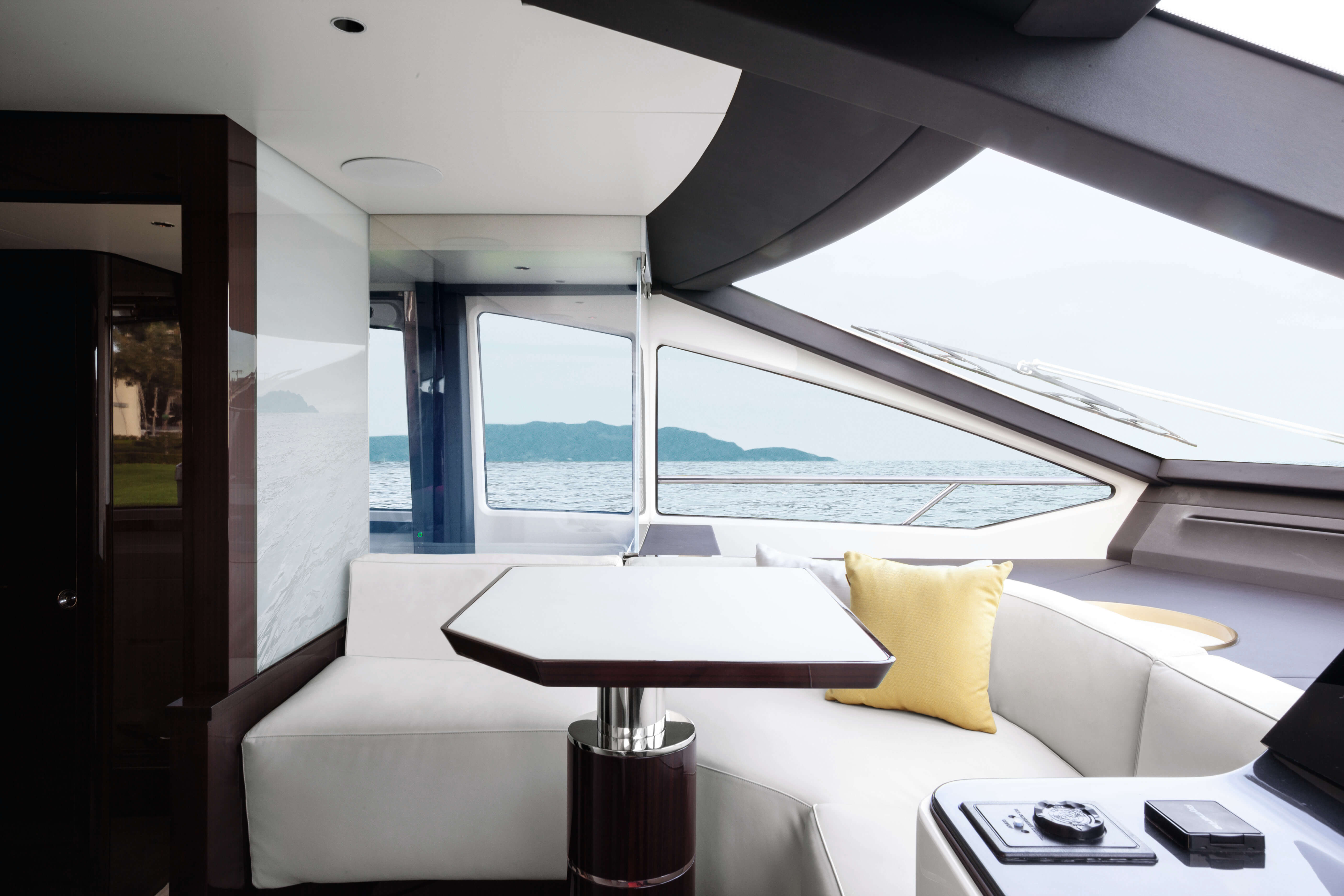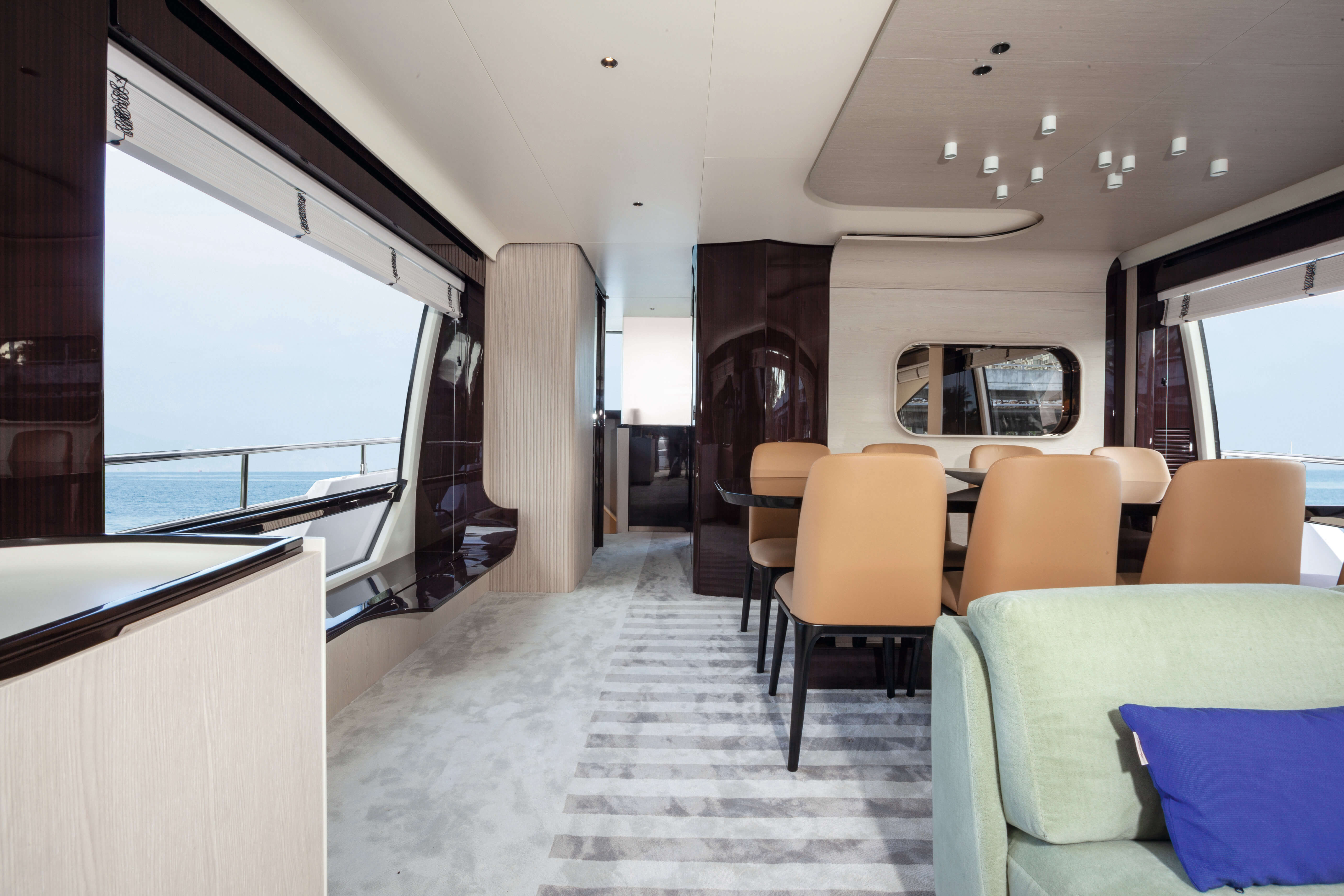 Un profilo scolpito dal vento, così aggressivo e al tempo stesso seducente da sembrare quasi sensuale, nasconde una barca importante, con interni ampi e voluminosi. Se il compromesso principale delle linee esterne è quello tra charme e tecnologia, grazie all’uso diffuso del Carbon-Tech e alla sinuosità creata da Righini, quello che più caratterizza gli esterni dell’Azimut Grande 25 Metri è la voglia di eleganza e charme informale. È un due ponti puro, con linee estremamente sportive e dinamiche che entra a pieno diritto nella famiglia Grande per la possibilità di separare nettamente la vita a bordo di equipaggio e ospiti.