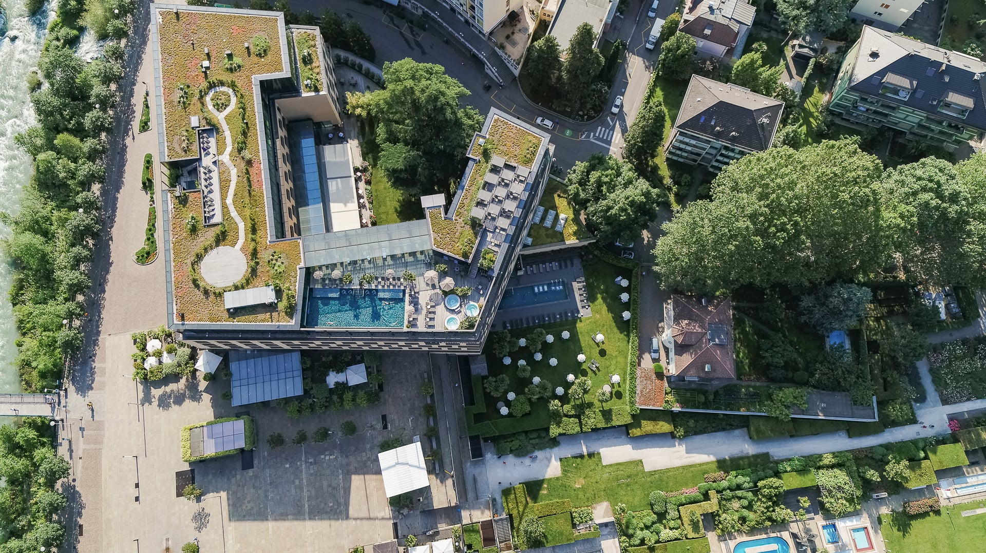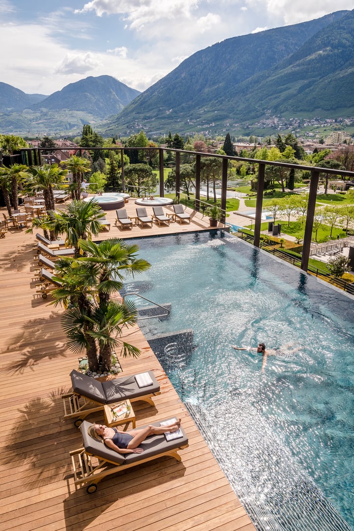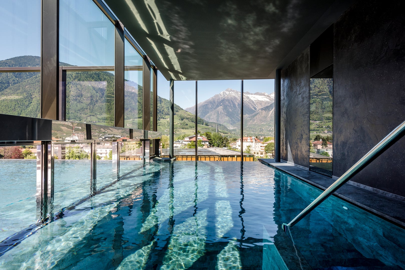 (A pochi metri dal famoso Kurhaus e dal centro storico, sulla riva del fiume Passirio è situato uno degli indirizzi più esclusivi di Merano. Un rifugio 4 stelle Superior dall’atmosfera domestica. Grazie all’utilizzo di materiali pregiati e naturali, l’architetto Matteo Thun ha creato un ambiente raffinato in cui ci si sente a proprio agio. Varcata la soglia dell’entrata del Design Hotel ci si rende conto di essere giunti in un luogo molto speciale dove “lifestyle” e “design” sono combinati in maniera unica. La spettacolare costruzione esterna conquista per le sue linee architettoniche lineari realizzate dagli architetti berlinesi Baumann e Zillich. La luminosa facciata, color crema, di pietra di arenaria, che risplende variando le diverse tonalità secondo la luce del giorno, si integra armoniosamente nel bellissimo paesaggio naturale dell’Alto Adige. Una volta all’interno si può ammirare l’ambiente raffinato, dall’eleganza semplice e dai caldi colori naturali. L’architettura interna dell’Hotel Terme Merano è opera dell’architetto e designer Matteo Thun. L’architetto altoatesino ha realizzato, non solo il progetto dell’Hotel, ma anche quello delle adiacenti Terme nel centro di Merano. Il raffinato design trasmette un particolare senso di accogliente “living”. )