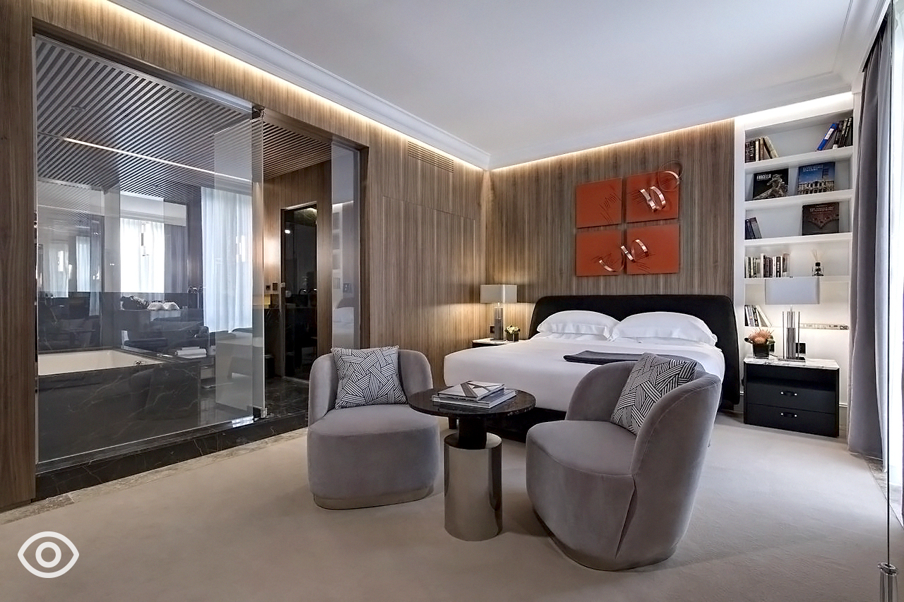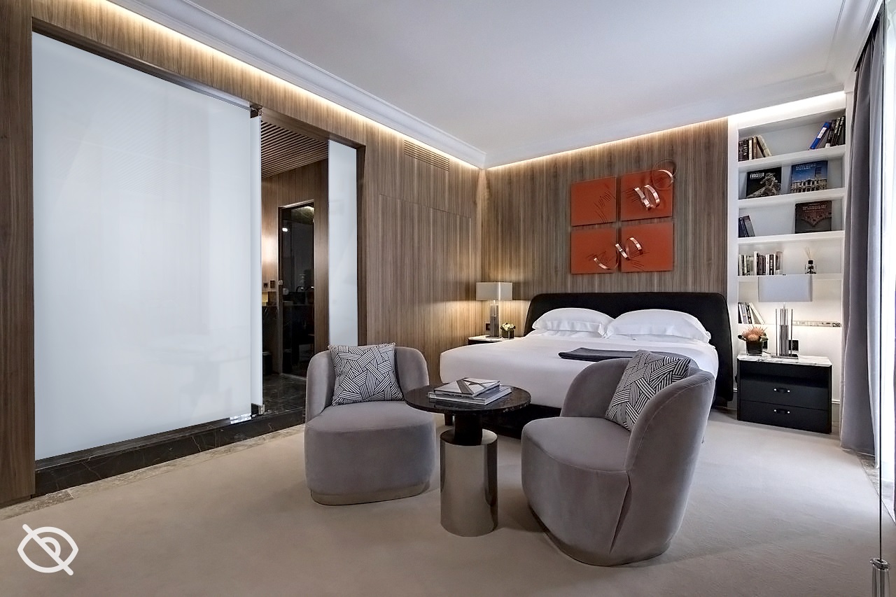 Questa suite dispone di una parete in vetro tecnologico con porta battente che definisce la camera da letto dal lussuoso bagno rivestito in pregiato marmo italiano Saint Laurent con doccia walk-in a pioggia, bagno turco e vasca idromassaggio.